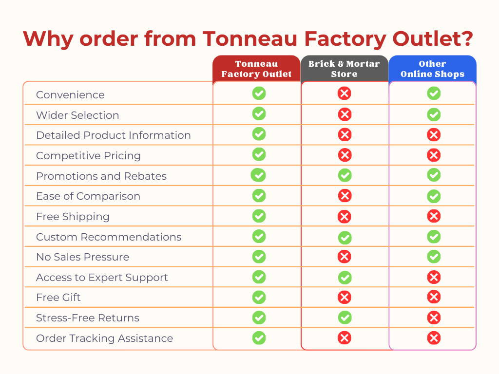 Tonneau Factory Outlet offers personal service in an impersonal world, we call it world class customer service because we want to earn your business for life! Tonneau Factory Outlet is the Web’s #1 Authority on Tonneau Covers since 2007.